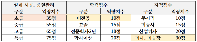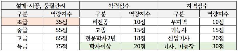 (고등학교 토목과나 건축과를 졸업하고 도장기능사나 방수기능사를 취득한 경우도 점수는 동일합니다.)